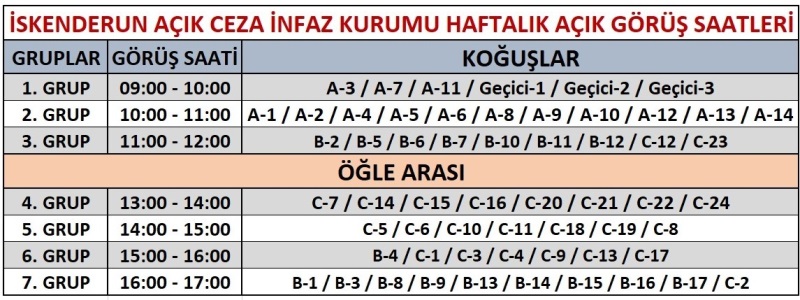 İskenderun Açık Ceza İnfaz Kurumu Ziyaret Kabul Birimi Haftalık Açık Görüş Saatleri